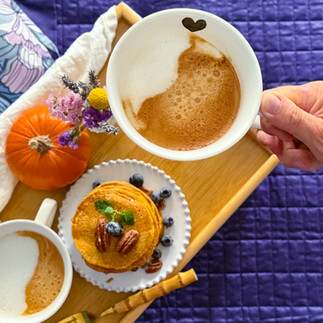 Servi i pancakes alla zucca per una colazione autunnale a letto, magari con una tazza di cappuccino fumante e la morbidezza delle lenzuola di cotone per un’esperienza cozy completa.